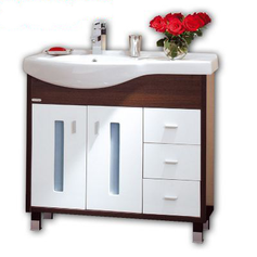 Параметры – 90/86/37 см (учитывается высота умывальника и опор). Тумба состоит из двух функциональных блоков:- слева – один над другим располагаются небольшие выдвижные ящички, снабженные доводчиками для удобного открывания;