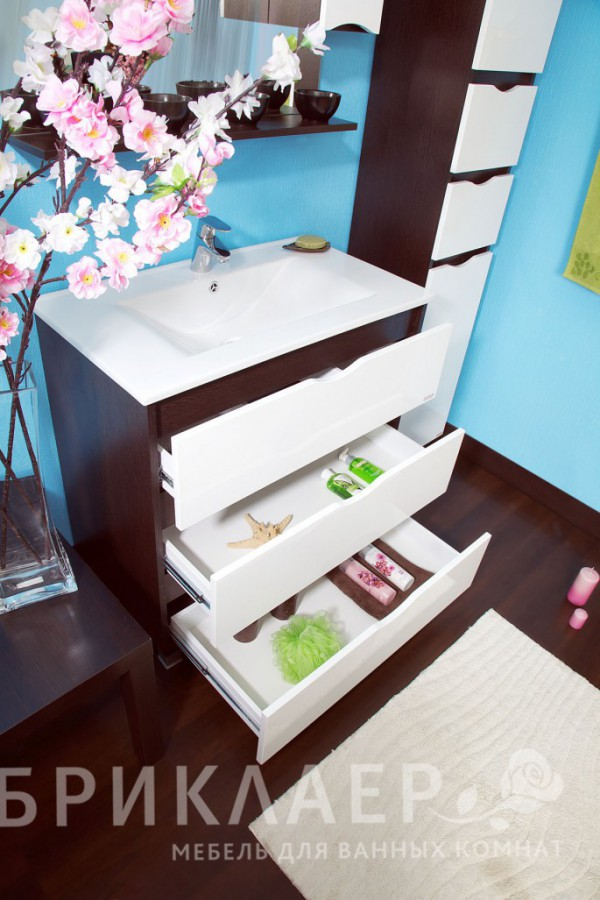 Доп. информация: Тумба изготовляется с тремя выдвижными ящиками на металлических направляющих. Высота тумбы указана с учетом умывальника и опор. Раковину необходимо крепить к стене.